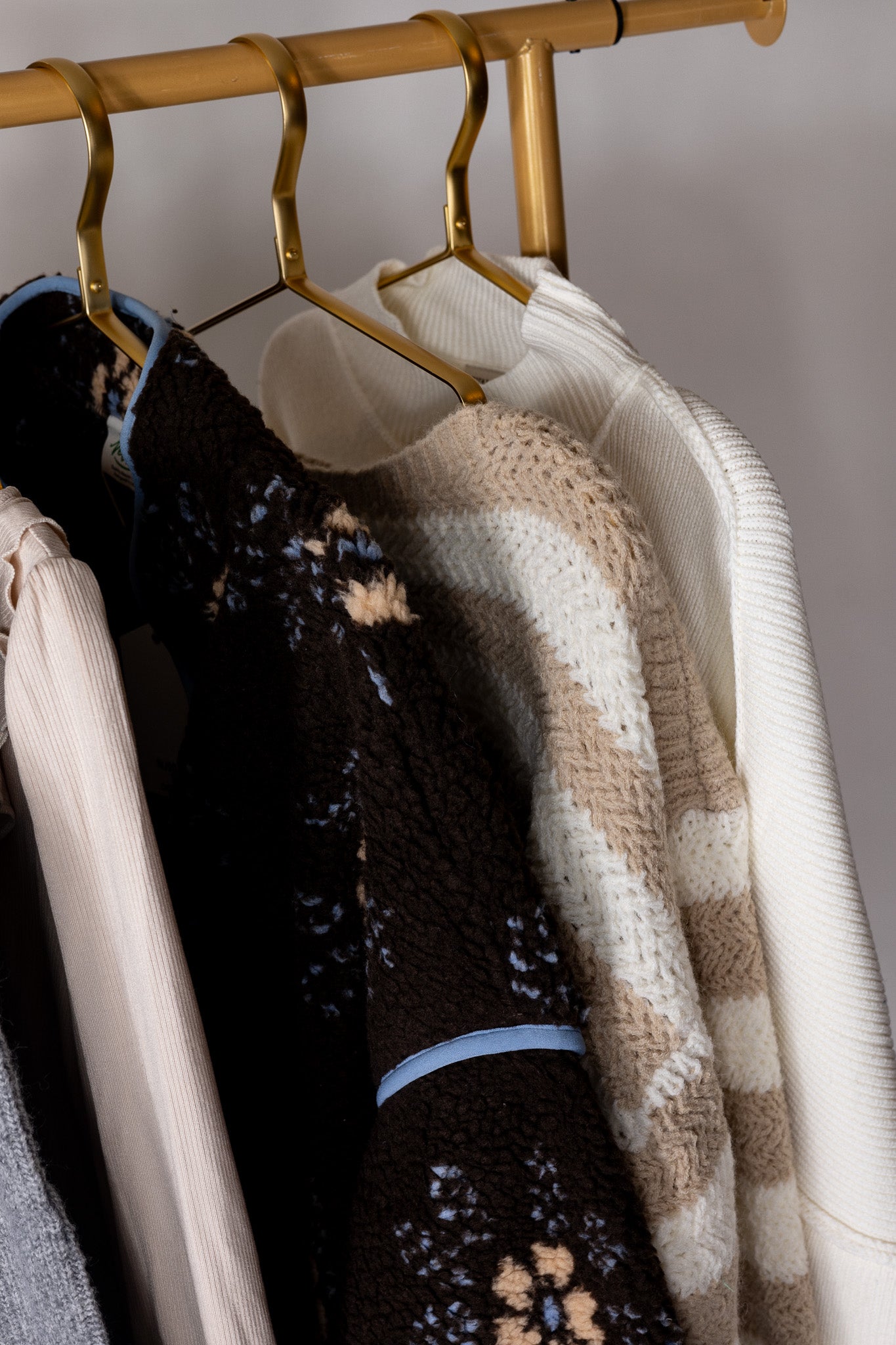 The Eva Striped Sweater is your new go-to for effortless style. Crafted from thick, cozy knit in cream and beige stripes, this elevated piece features a chic boat neck and generously wide sleeves that make a statement. Perfect for layering or wearing solo, it's the kind of sweater that feels like a warm hug while looking absolutely put-together. Dress it up or down—this chunky knit does it all with playful charm.