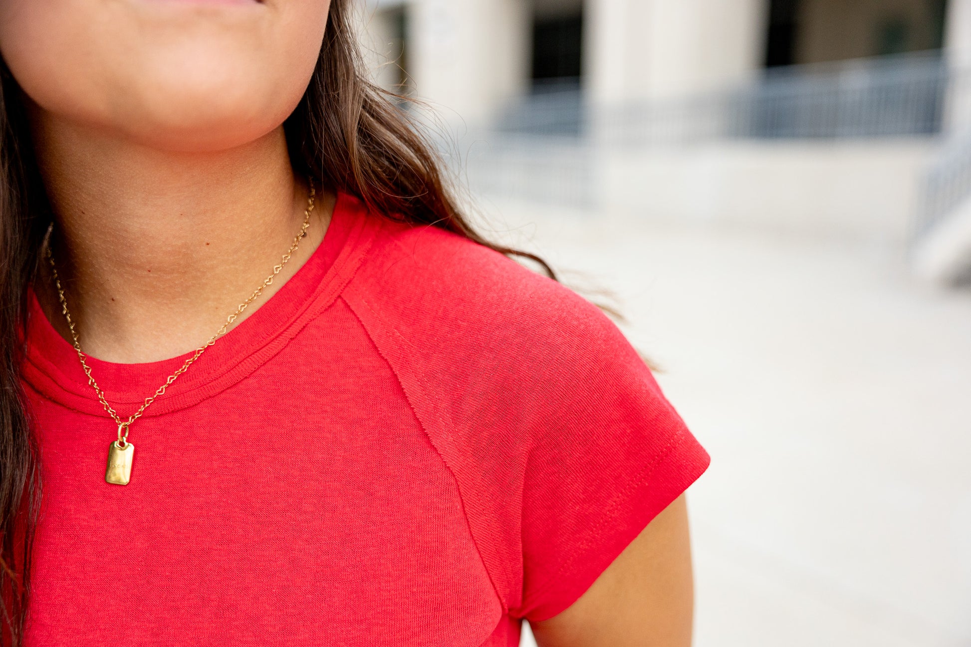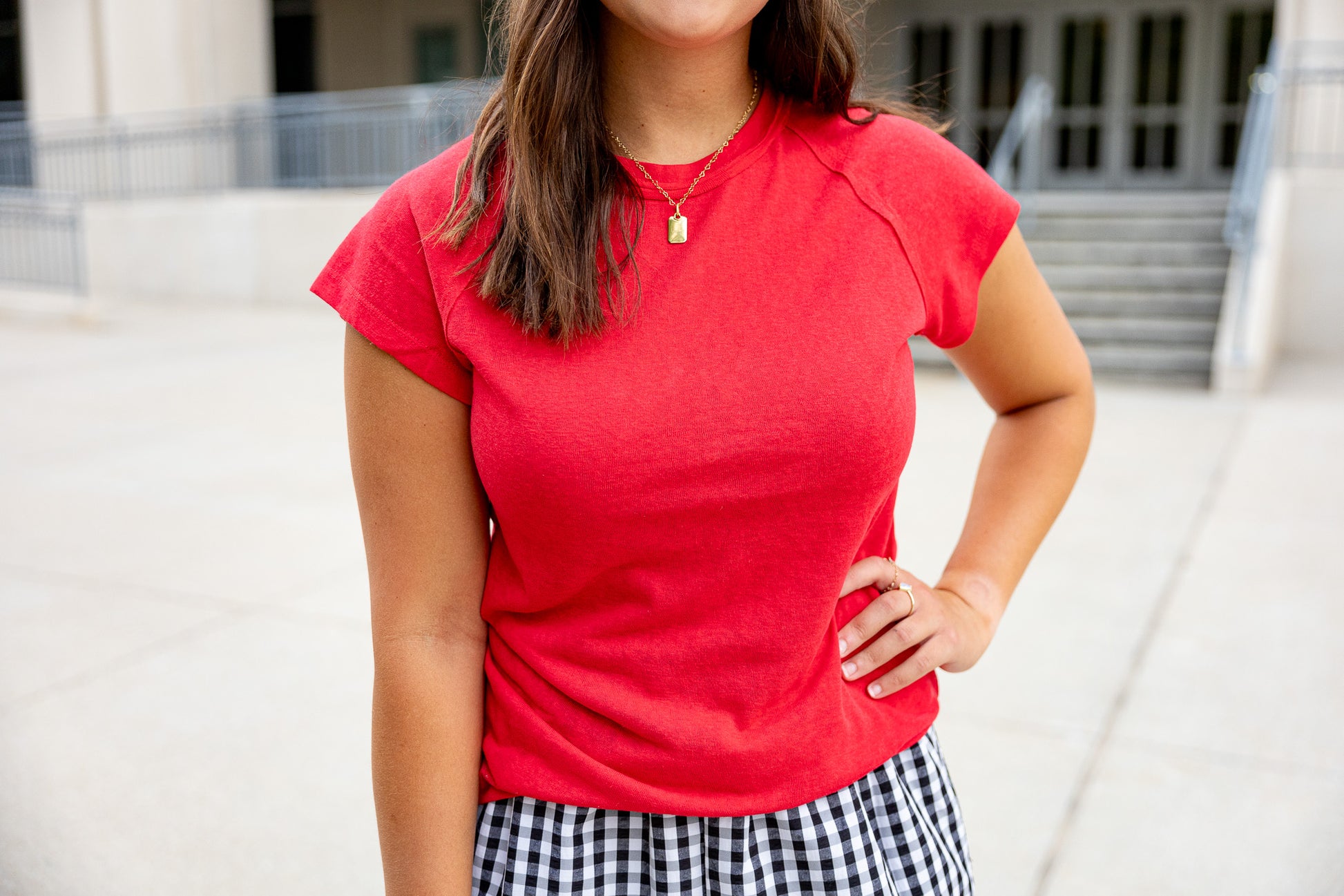 Add a vibrant touch to your wardrobe with the Ruby Red Everyday Tee. Featuring a rich red color and a stylish raw hem stitching detail on the back, this basic tee offers a flattering longer hip length and a curved hem for a modern silhouette. Perfect for adding a pop of color to any outfit, it combines comfort and effortless style for everyday wear.